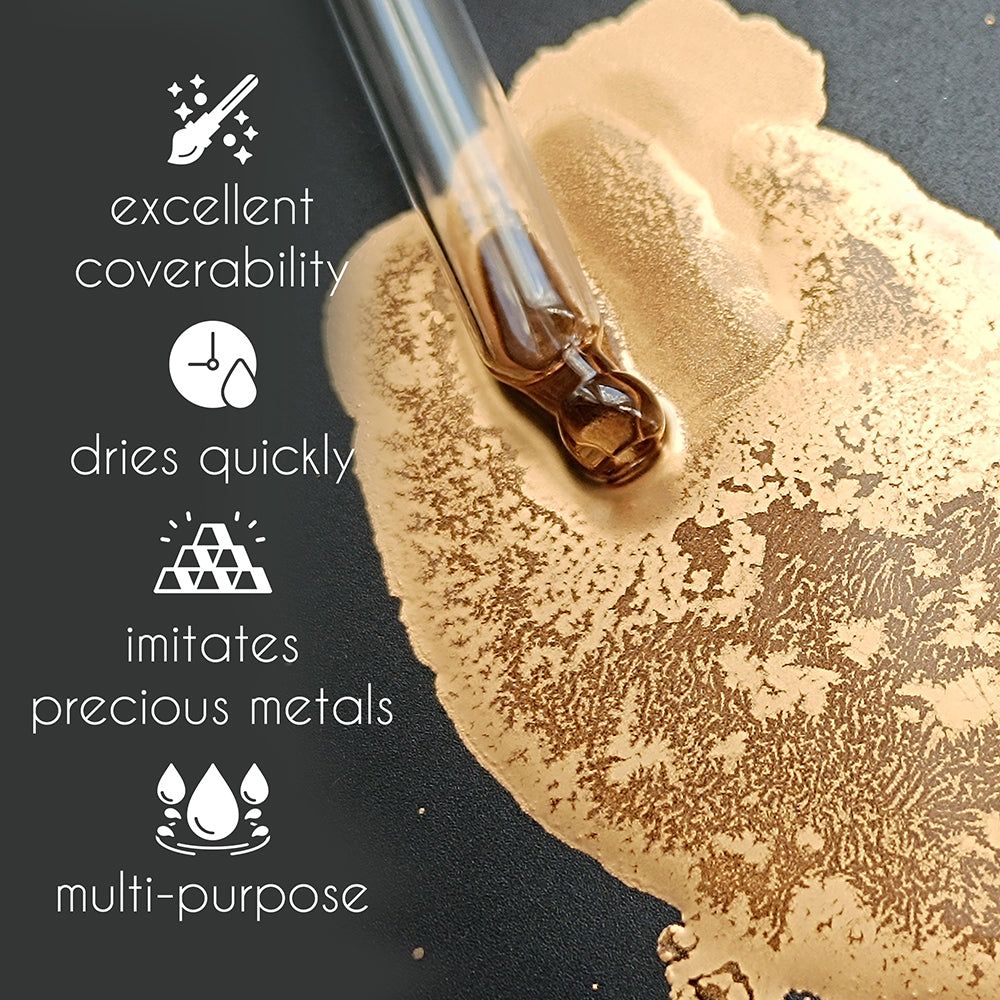 Liquid Metal Leaf by ScrapEgo is a fast-drying, alcohol-based metallic paint with an intense, shiny finish. It’s designed to replicate the look of precious metals and add a luxurious gilded effect to a wide variety of surfaces:
